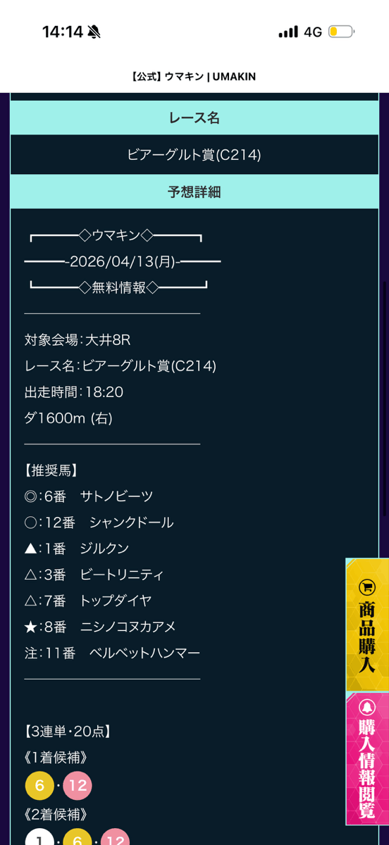先週の大阪杯のレビューみて利用してみました。 3連単推奨でしたけど3連複でも充分配当あったのでよかったです。 さすがの本命馬でしたね、これとは別に馬単ももらいました。 ありがとうございます