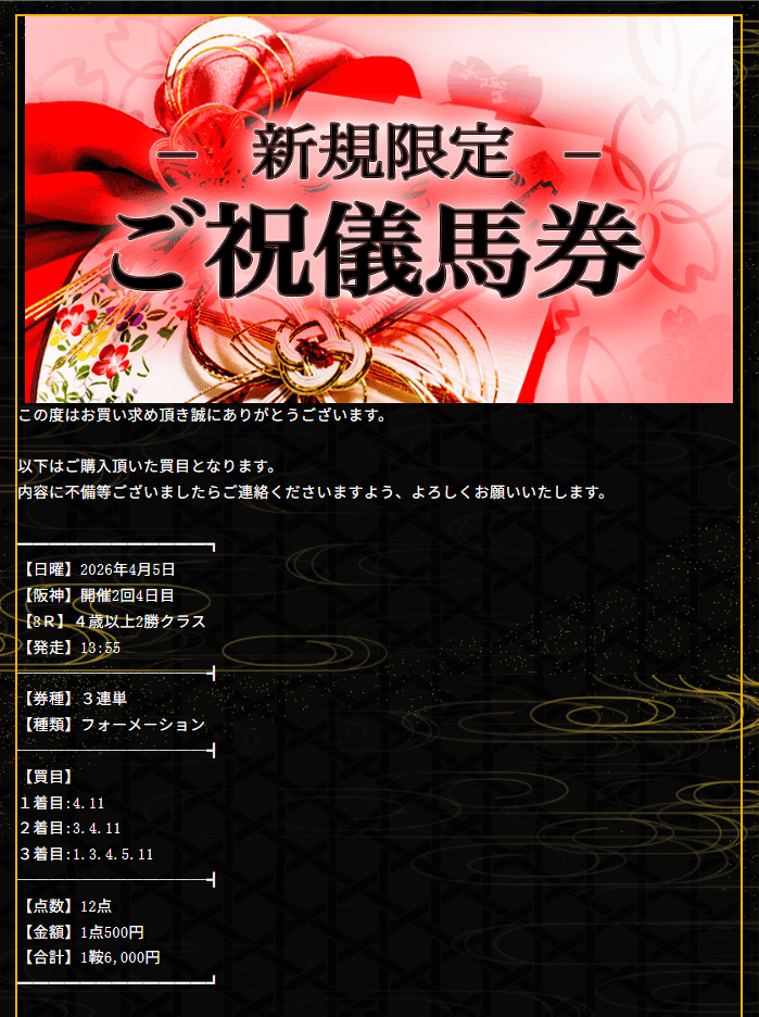 初回からこんな的中を馬券代たった6千円(1点500円)で貰っちゃったら永続利用&リピート確定!