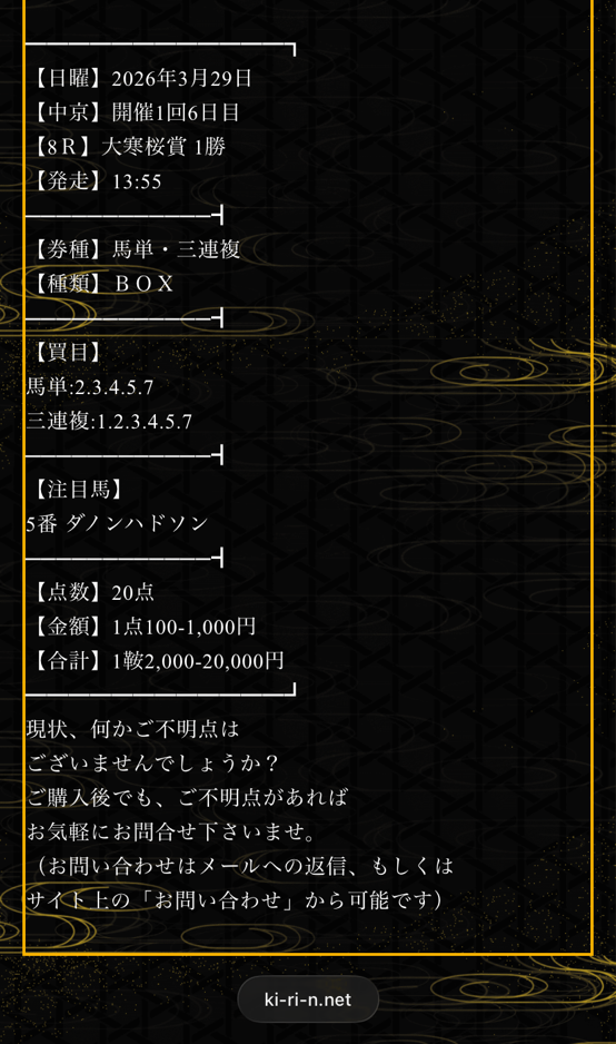もう2年以上愛用していますが今も昔も変わらぬ的中率で安定した収支が得られています。 今回もダブル的中で5万1600円払い戻し、麒麟に出会うまで散々騙されてきたからようやく信用できるサイトを永続的に利用できています。