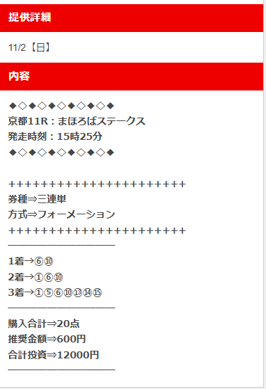 穴馬ch25の11月16日のG1エリ女無料予想3連複89.2倍×800円的中で7万1360円払い戻し貰えました! 1着2着3着フォーメーション通りに3連単買っていても的中だった買い目です、1点100円でも買っておけば万馬券的中でした、凄い予想です!