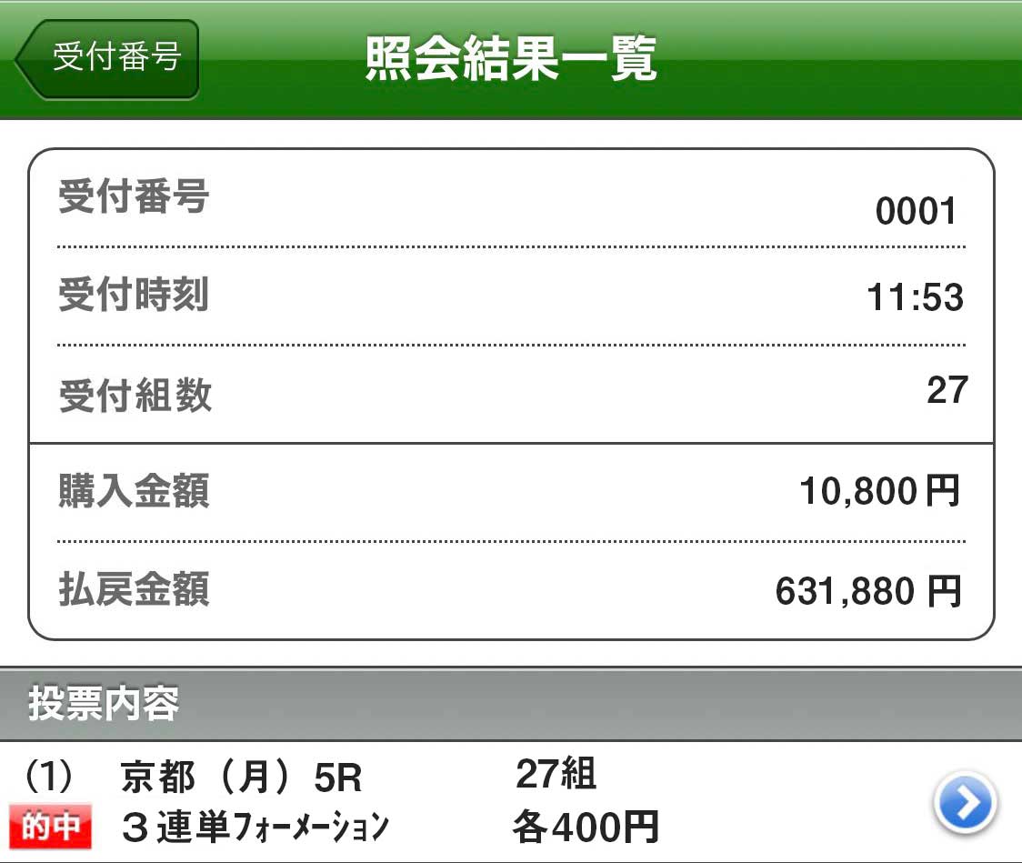 12/15(月)無料情報利用の検証結果です。 金沢3R予想、3連複フォーメーション買い目10点予想 1点500円・馬券代5000円 結果→3連複/110.7倍的中 払戻→5万5350円 余談ですが3連単も同じ買い目で361.3倍的中 3連複で5万弱でしたが3連単5-4-2的中した買い目で買っていれば 払戻18万650円、タラレバになってしまうが こっちも買ってれば3連複の3倍ちかく稼げました。