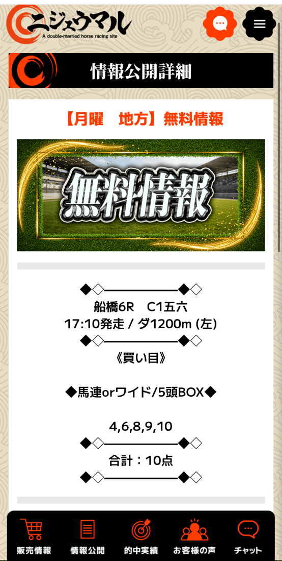 ニジュウマルの無料予想&有料予想ダブルで的中貰えました!